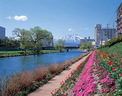 県北の水源から宮城県北上町追波湾まで、総延長250km。全国5位の大河。岩手の母なる川である。この北上川と秀麗な岩手山は、盛岡を代表する景観の一つ。開運橋、旭橋、夕顔瀬橋などがビューポイントで、色とりどりの花が岸辺を彩る。