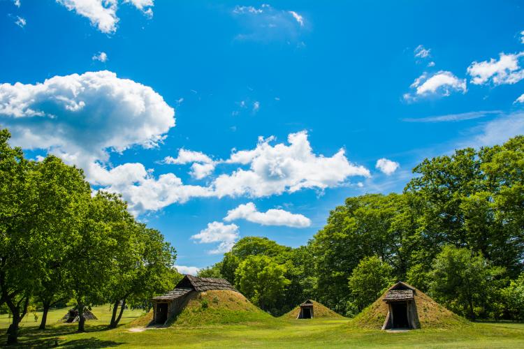 縄文時代中期の大集落跡、国指定の御所野遺跡。公園内では竪穴住居やストーンサークルなど、当時の様子が復元されている。博物館では、縄文時代と御所野遺跡、この地域の文化について学ぶ事ができる。遺跡と駐車場をつなぐ木製歩道橋「きききのつりはし」も一見の価値あり。