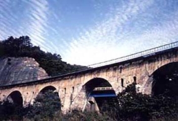 JR釜石線の通称「めがね橋」は、半円が五つ連なるアーチ橋で、正式名称を「宮守川橋りょう」と言います。JR釜石線の前身である岩手軽便鉄道は、宮沢賢治の童話「銀河鉄道の夜」のモチーフになったとされ、春、夏、冬の観光シーズンに緑色や橙色でライトアップされためがね橋は、道行く人を幻想の世界へと誘います。平成21年4月、恋人の聖地として認定されました。