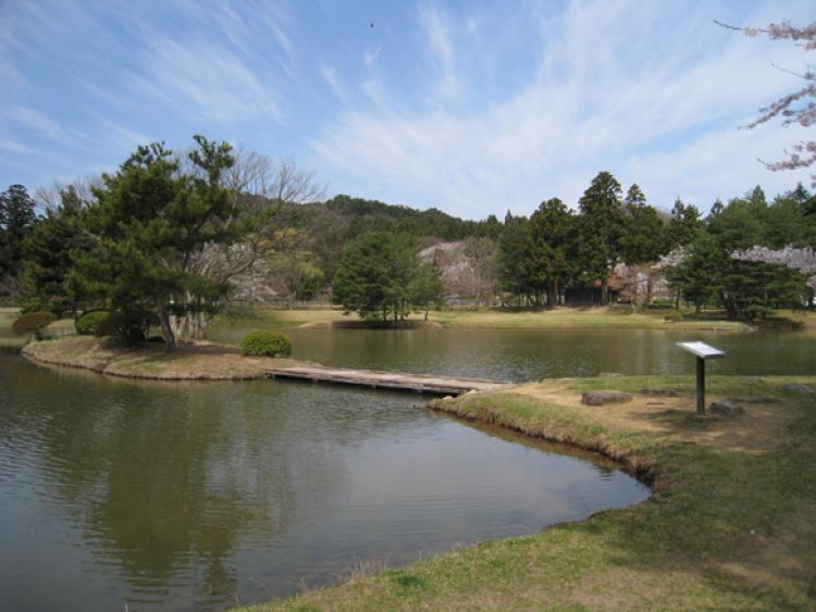 毛越寺の東に隣接する観自在王院跡(かんじざいおういんあと)は、二代基衡夫人が営んだと伝えられています。寺域は、東西120m、南北240m。四隅が丸くなった方形の苑池(舞鶴が池)には、巨石を積み重ねた荒磯様の石組、小じんまりした洲浜(すはま)、東西に長い中島などが点在しています。北岸は広庭、それに向かって西に大阿弥陀堂跡、東に小阿弥陀堂跡。東岸には、鐘楼(しょうろう)跡と普賢堂(ふげんどう)と伝えられる遺跡もあります。