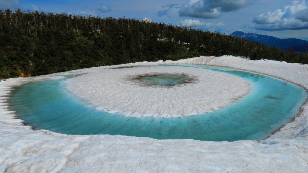 八幡平山頂遊歩道にある「鏡沼」。春の雪解けの様子が龍の眼に似ているといわれ、「八幡平ドラゴンアイ」と呼ばれています。5月中旬~6月中旬に運が良ければ見ることができます。