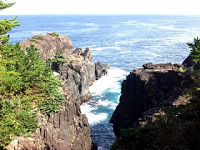 の一部が陥没して切り立った崖と崖の間に狭い水路ができ、太平洋の荒波が打ち寄せ侵食しています。