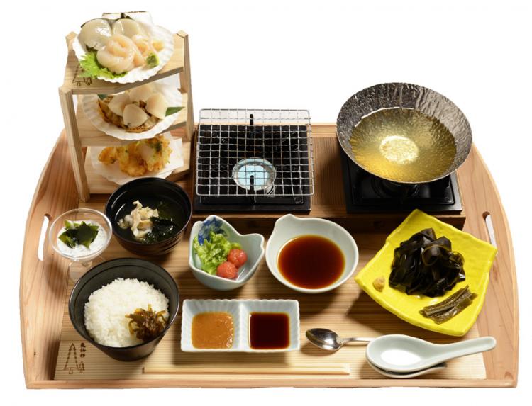 陸前高田市が誇る3つの食材(広田湾産活ホタテ・ワカメ・ブランド米「たかたのゆめ」)を贅沢に使ったおもてなし膳。