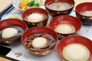 中尊寺、月見坂の正面に構えるレストラン源。人気の「平泉もち御膳」は平泉に古くから伝わる伝統的なもてなし料理で、あんこ、しょうが、ずんだ、辛味、白胡麻、雑煮と6種類のお餅を堪能できます。