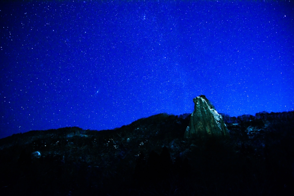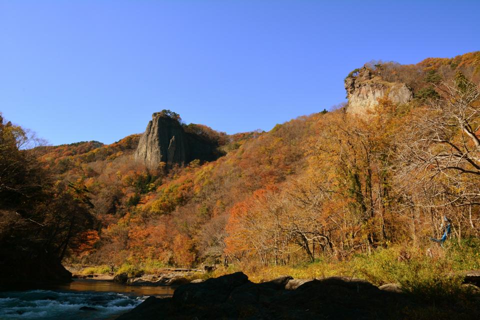 จุดชมวิวหินและหน้าผาที่มองเห็นแม่น้ำมาบุจิ หินขนาดใหญ่โอกามิอิวะ (180 ม.) และเมกามิอิวะ (160 ม.) เป็นหินที่ใหญ่ที่สุดในญี่ปุ่นและได้รับเลือกให้เป็นจุดชมวิวระดับชาติ