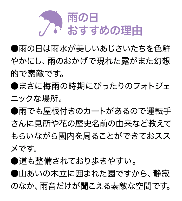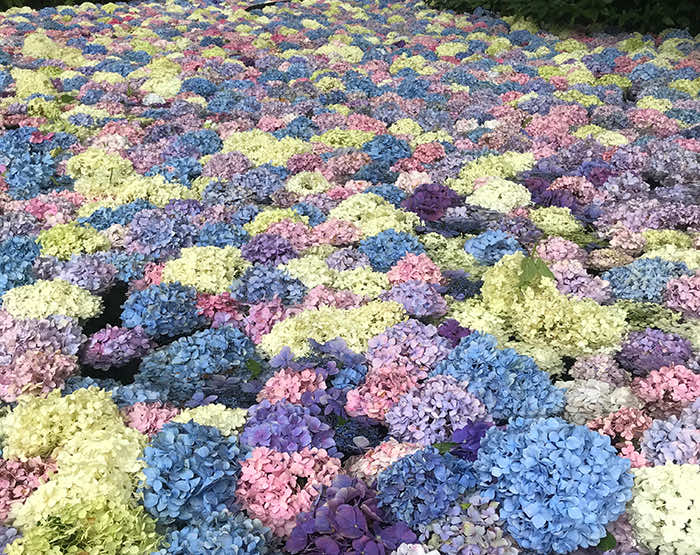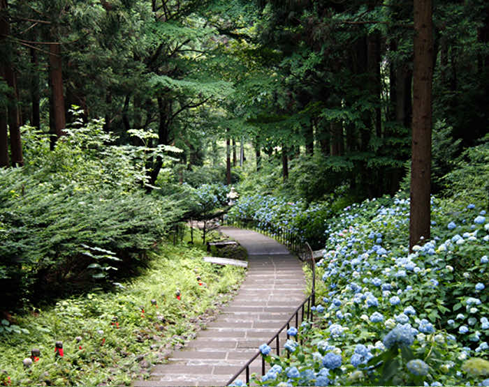 從6月下旬開始的大約一個月的時間里,杉山的小巷裡裝飾著五顏六色的繡球花。 大約400種和40,000株繡球花種植在東京巨蛋大小的廣闊雪松山上,它們一個接一個地綻放。 還有一個休息區,所以你可以放鬆和享受大自然。
