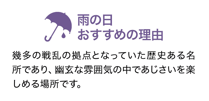 自古以來統治該地區的富裕家庭住宅的廢墟。 據說在平安時代末期,藤原常清和他的兒子清平將其建成了堡壘。 此外,為了紀念景慶和慶珩父子的成就,還建造了八角形的大廳建築,即日成院(佛像保存)。 除了繡球花,您還可以欣賞櫻花和楓樹的四季風光。