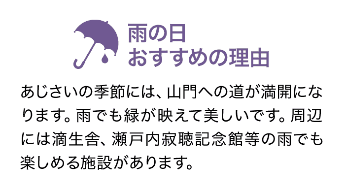 天臺寺是一座擁有1200年歷史的古寺。 當他擔任天臺寺的住持時,他呼籲人們恢復因砍伐雪松樹而在戰後年久失修的寺廟場地,並開始種植繡球花。 如今,在初夏,紫色漸變繡球花在入口和寺廟場地的石階上綻放,為這座古老的寺廟增添了高貴的色彩。