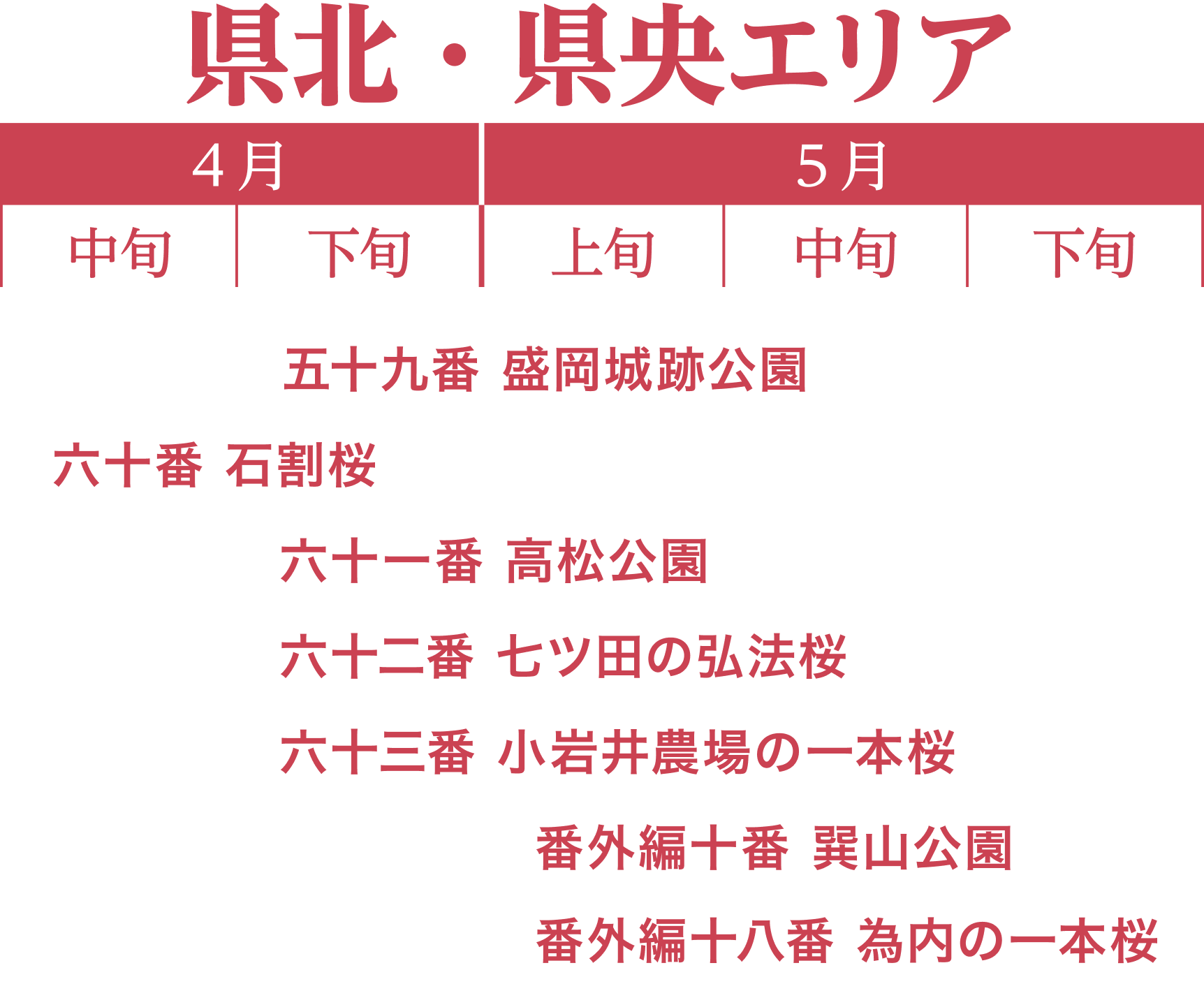 盛岡市有許多著名的櫻花景點。 據說已有360多年歷史的「石原櫻花(60-ban)」樹,盛岡城遺址公園和寺町街龍國寺的盛岡桫椤同時綻放。